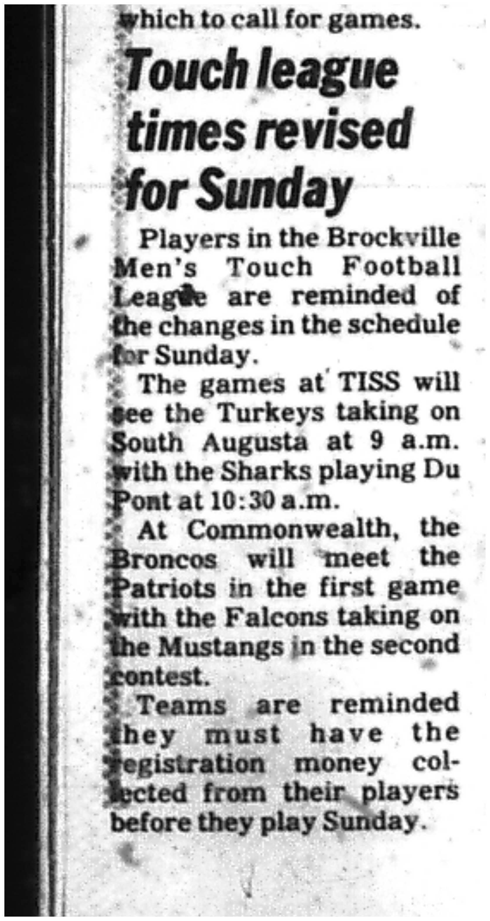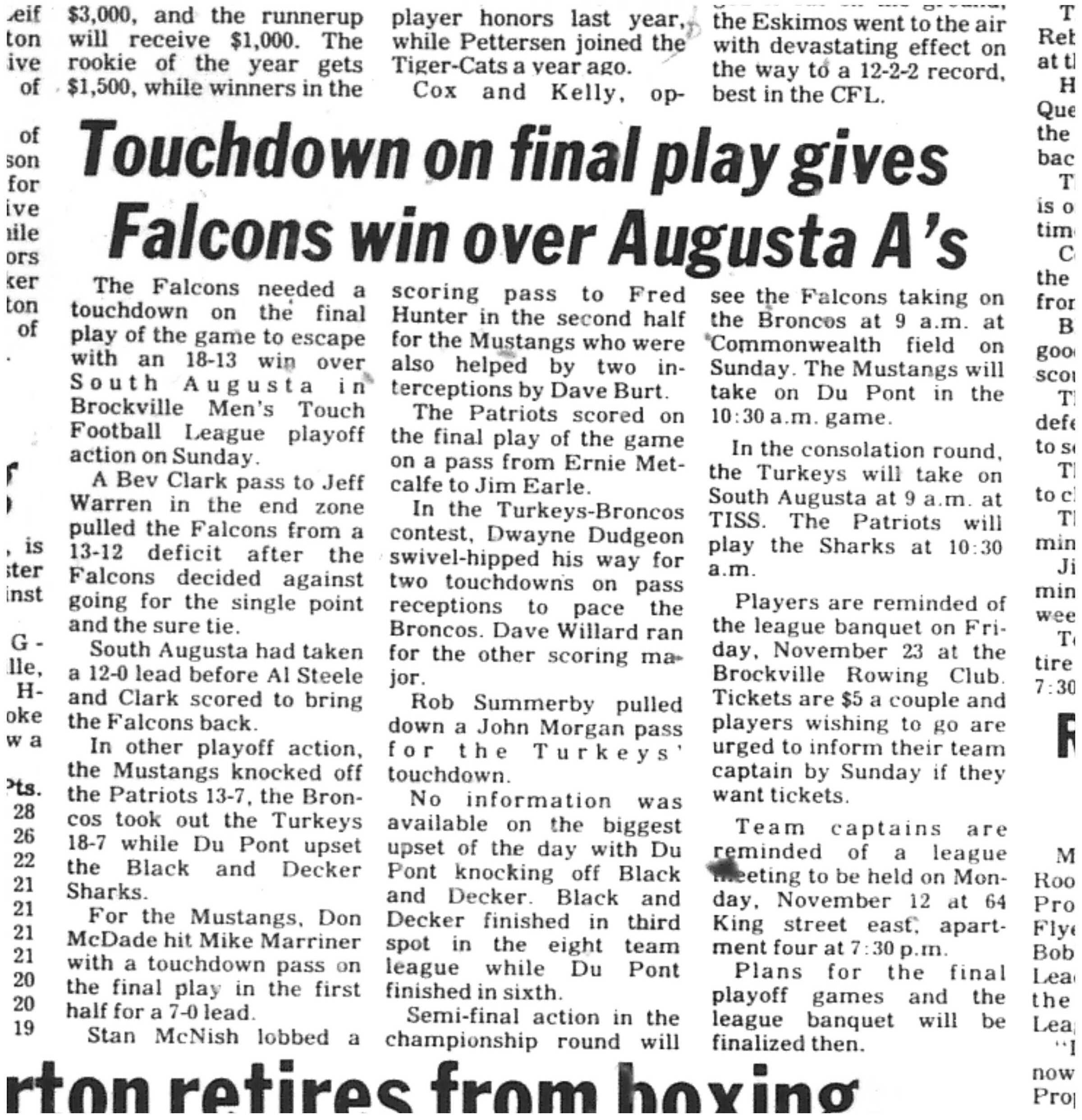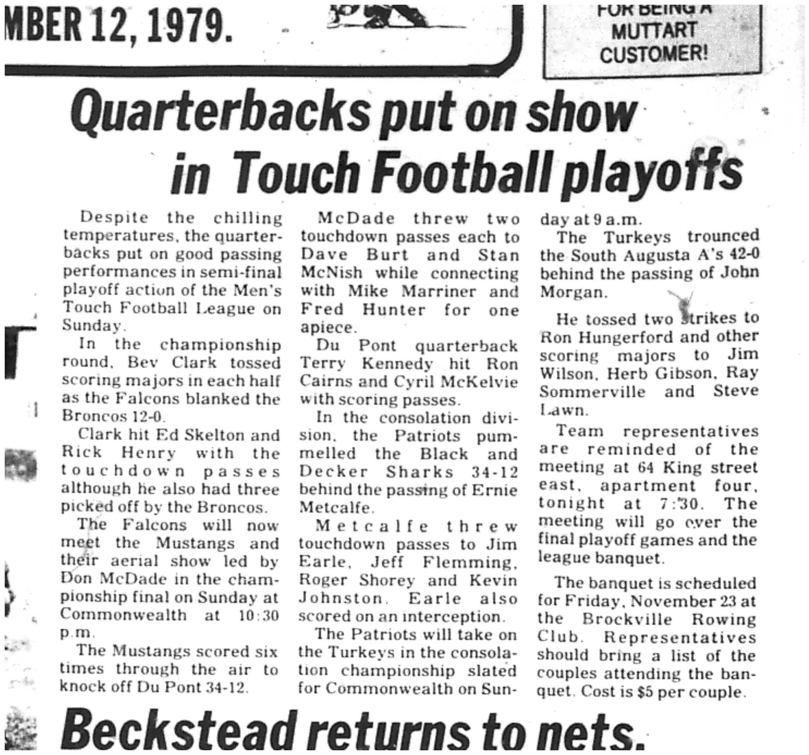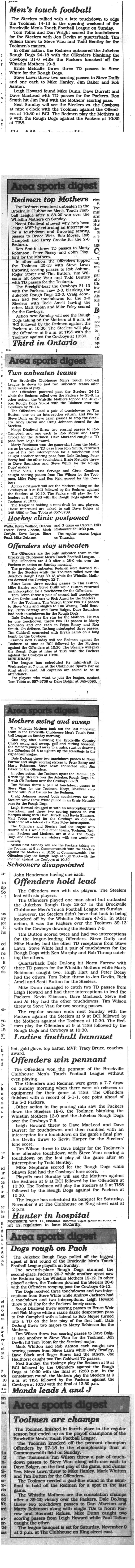 Since 1976, the BMTFL has brought together 12 to 16 teams each fall for a competitive and spirited 10-week season of one-hand touch football — no blocking, just pure skill and strategy. Games are played Sunday mornings on local Brockville fields from September through November, culminating in the most legendary banquet in town. Join us as we mark five decades of tradition, community, and the love of the game.