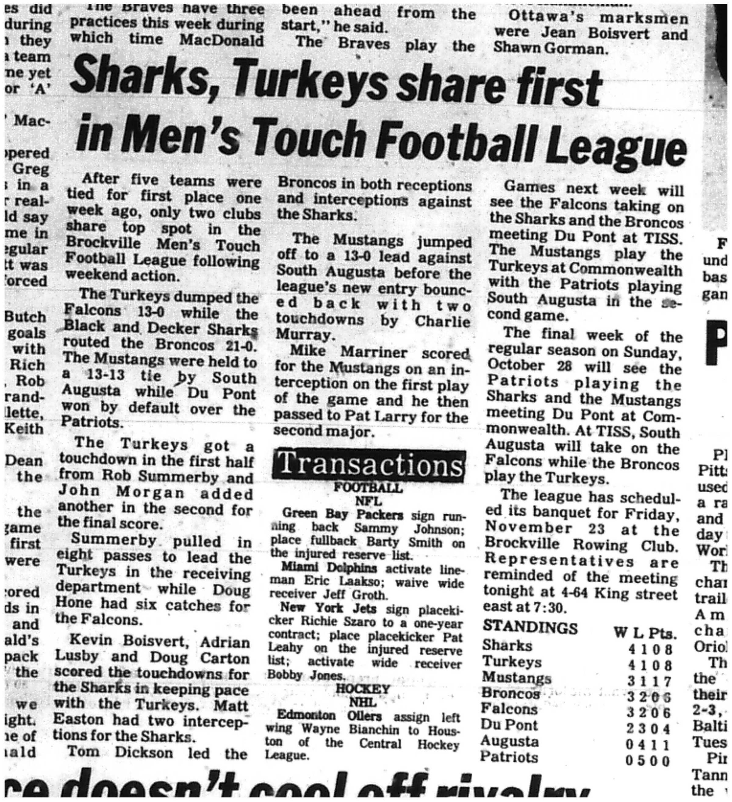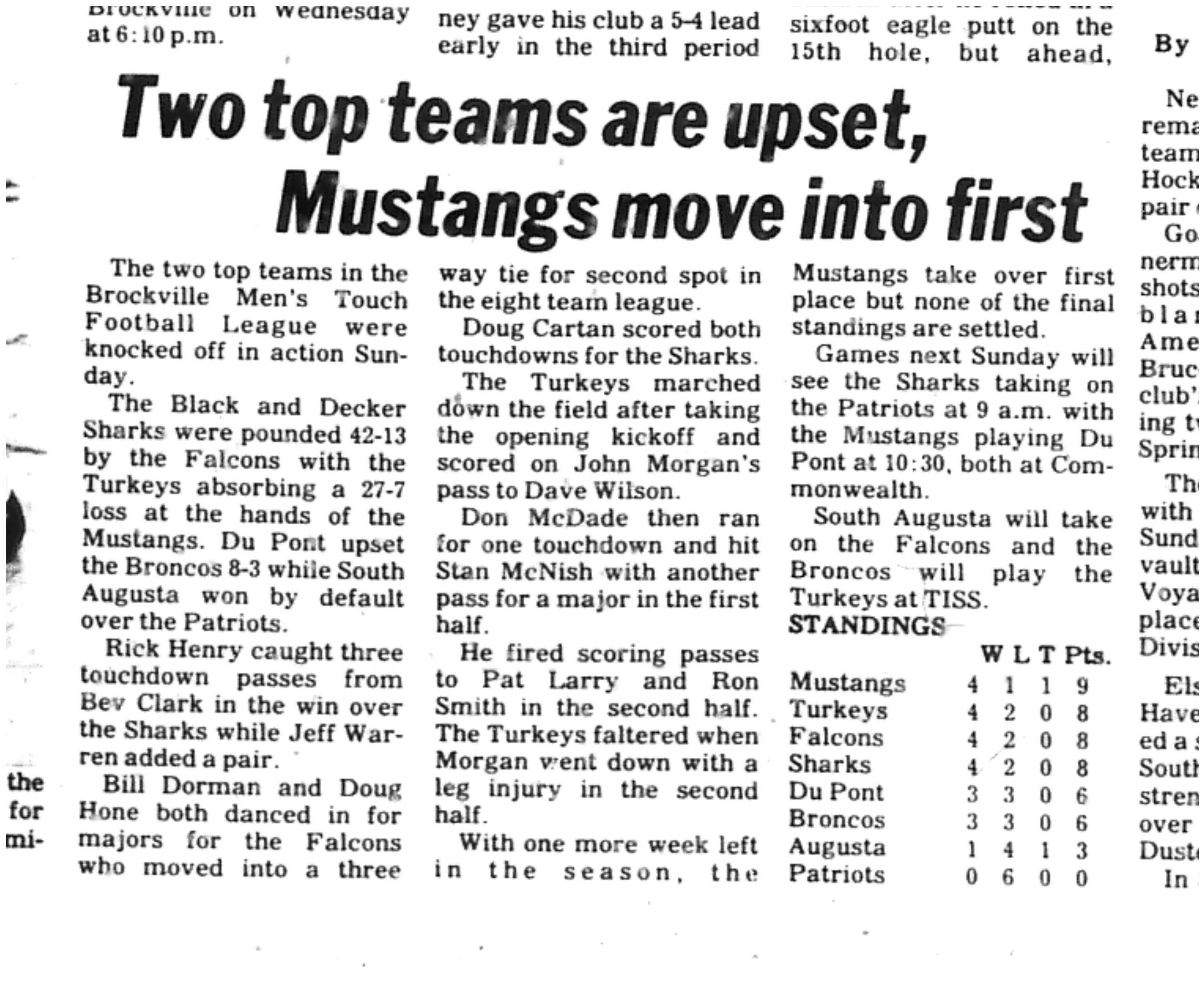 That’s it for the regular season! Starting with the Hoy-Hone conference. The Sharks in their first season end with a loss to 1000 Islands Brewmen 20-0 but are at the top of the conference. The Brewmen climbed off the bottom and ended in 5th place! 2nd in this conference, Leatherheads with a 31-12 win over the struggling Marauders, without key players who ended in last in the division setting them up as the underdog next Sunday. In 3rd is the Whist’lin Mothers after tying the Dutchmen 21-21 but leaving the Dutchmen in a very close 4th place as the Mothers had a better PA. In the Smith-Baker conference, we have 7-0 Gabriel Pizza in first place with their win 16-8 over the 3rd place Slumdog Slingers. 2nd place is Pastime Peelers hanging on after losing to Team McNish 20-7. McNish’s land in 5th place. 4th is now McArthurs Barber Shop after an exciting finish. Last play of the game, Miracle Maids up 12-6. Mcarthur’s scores and converts to win the game. This landed the Maids in last place in this division. whew! Excellent lead into next weeks playoffs. Remember to supply refs and check the schedule for game matchups! Watch out for the underdogs next week! Anything can happen to set up the run to the Championship game!
