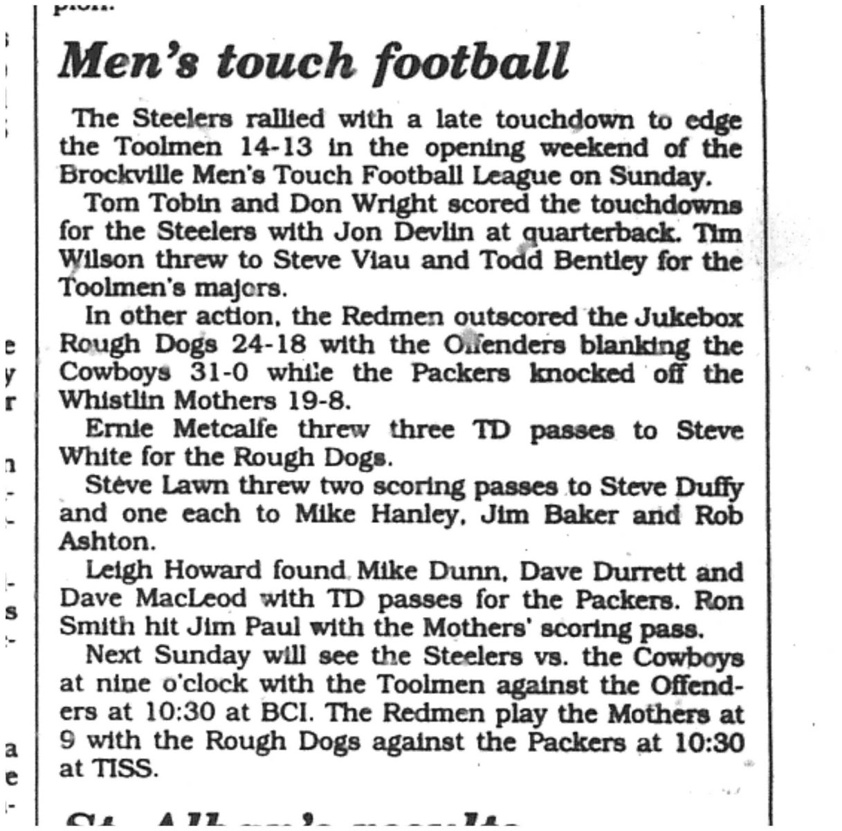 ’Twas the night before Super Saturday in Brockville town, Where the river ran calm as the sun settled down. The bleachers stood ready, the grass shining bright, For football was coming — the crown was in sight. From King Street to Central, the talk filled the air, Of the semis and finals soon happening there. The fans all prepared, their scarves wrapped up tight, For tomorrow’s the battle, beneath Saturday’s bright sun. In the A Division semis, two games would be played, Where legends are written and rivalries made. The first — Gabe’s Pizza with grit on their side, Face the Dutchmen, fierce and full of hometown pride. The second — a clash that’s sure to excite, As the Sharks and Leatherheads square off in the light. Their cleats on the grass, their focus like steel, Each team determined to seal the next deal. The chatter in taverns was hearty and loud, As pints clinked together — a true Brockville crowd! The beer was a-flowing, the laughter ran deep, For tomorrow’s the day no one dares oversleep. And when those semis are settled and champions are near, The B Division Final brings one more cheer. MacArthur’s Barbershop, sharp as their fades, Face Miracle Maid Maniacs, cleaning up plays. From tackles to touchdowns, from cheers to the calls, The echo of victory rings through the halls. And when champions rise and the night’s winding down, The beer will keep flowing all over the town. For this is Brockville — proud, strong, and true, Where football and friendship are stitched through and through. So rest now, dear players, let destiny call, For tomorrow’s Super Saturday belongs to us all!