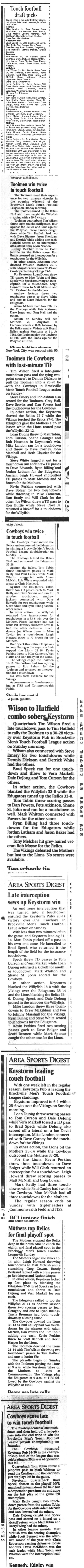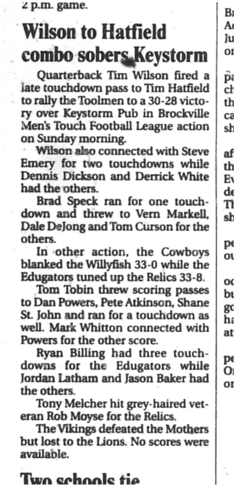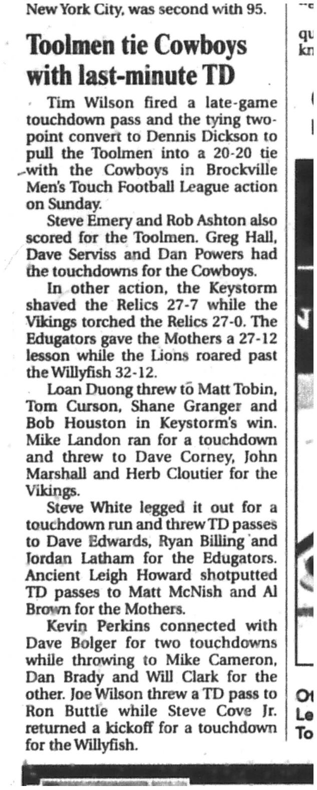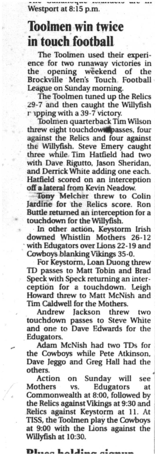 Week 9 games have now eliminated half the teams. Gabriel Pizza has advanced to Super Saturday with a 26-12 win over Slumdog Slingers and Gabs will face Dutchmen at 9:30am at Commonwealth. Slingers will be hitting the golf course! The Dutchmen beat the Whist'lin Mothers with a near perfect game by a score of 24-0. Sending the Mother's to the grandstand for Super Saturday. The Sharks took a bite out of Pastime Peelers, winning 15-7. Sharks will match up with Leatherheads at 9:30am at TISS after they won 13-0 over 1000 Islands Brewmen who can now spend Saturday sitting with the Mother's in the grandstands listening to the live play reporting by our own Tim Hatfield. At 11:30am at Commonwealth, the B-side Championship will be played by McArthur's Barbershop and Miracle Maid Maniacs. McArthur's beat the all season struggling Marauders with a score of 37-0. Maids won 13-7 over Team McNish. Championship game will be played at 1:30pm at Commonwealth. Then at 4pm, the Banquet will start at the Keystorm pub for all players. Awards will be announced at about 4:45pm with food available at 5:30pm. Expect the Keystorm to open to the public by 7pm. See everyone there for the finish of the 50th Season!