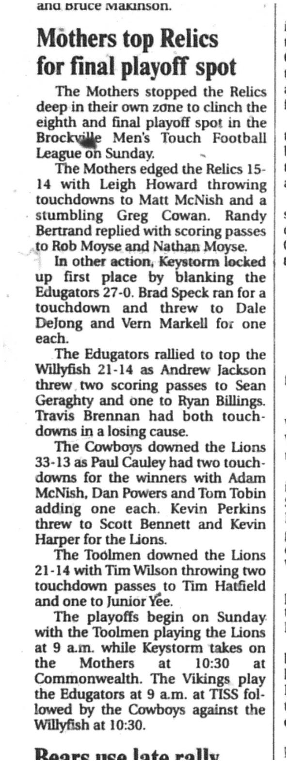 First round of the playoffs have decided who will play B side and who will advance to the Championship games. In the first week of the crossover Playoffs at Commonwealth, Whist'lin Mothers send McArthurs to the B side as the highest ranked team. Mother's win 26-12. Second game had Leatherheads advancing with a score of 14-0 over Team McNish sending McNish's to the B side as the second ranked team. Final game at Commonwealth had the Marauders start with a sub as they only had 6 players and conceded the game by using a sub. But either way, Gabriel Pizza completed the game with a win 28-14 with the Marauders eventually fielding a full 7 players. Ryan Bertrand did an excellent job at QB in the loss but sending them to the B side as the ultimate underdog. At Tiss, Slumdog Slingers lose to the Dutchmen, 20-14, but manage to bounce to the A side with a PA of 6 points. Watch for Slumdogs to come strong next week. Game 2 at TISS had 1000 Islands Brewmen continuing their comeback by beating Pastime Peelers with a score of 13-7. Both teams still advance to the A side next week. Final game at TISS, Sharks best Miracle Maids 26-15 sending the Maids to the B side as the 3rd ranked team. Check the schedule for next weeks games and don't forget to check if your team is Reffing. Last week of playoffs are elimination. Only the winners will play on Super Saturday. Good luck everyone and lets finish our 50th season strong!