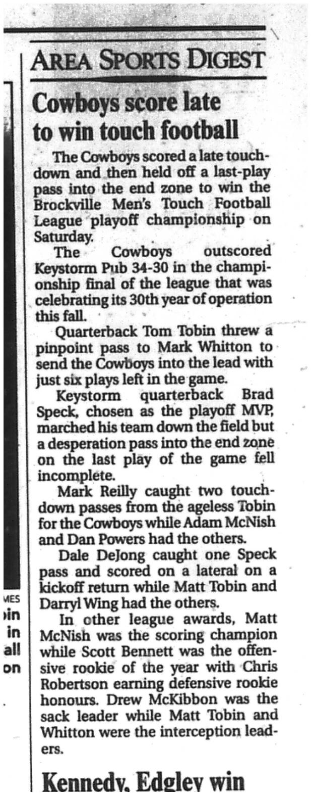 So the 50th season is all done. Leatherheads won the Championship. Miracle Maid Maniacs won the B side trophy. Offence award went to Wade Zanchetta with 10 TDs and a total of 63 points. Interception award went to Jacob White for 12 INTs in 7 games. Rusher of the year was Chris Cook with 18 sacks in 7 games. The Championship winning QB was also the QB award this year, Tanner DeJong with 23 TDs, catching 2 INTs and getting 2 sacks on defense. Rookie Offense went to Zach Burnside with 26 pts. Roberto Noonan received the Rookie Defense award with 7 sacks. The Johnny Mac award went to Ian Speer. The Center award mug was given to Jack Wilson. The Whist'lin Mothers voted Jacob White as 2026 President with Devin VanBlitterswyk winning the Golden Boot in his Rookie year and Andrew Evans sipping from the Golden Slipper as rookie of the year. The BMTFL Micah Baerwald Sportsmanship Award went to Leigh Howard who claims it was his final year even with a bar full of players chanting "ONE MORE YEAR!" Leigh fits this award with his long playing career, dedication to his players, his sportsmanship to both team and competitors on the field and at the Banquet. Congratulations Leigh. The 50/50 money of 735$ went unclaimed and will be donated to a local family as food during the holidays with Dan Thompson's help from the Keystorm Pub. BMTFL also donated 400$ to the Kinsmen snowsuit fund. Our biggest donation will go to Brockville Harvest sharing with a corporate donation match that will put 4000$ to the food bank. That is a whopping 5100$ to charity from a league of 146 players and refs with their families and friends donating also. That is impressive!